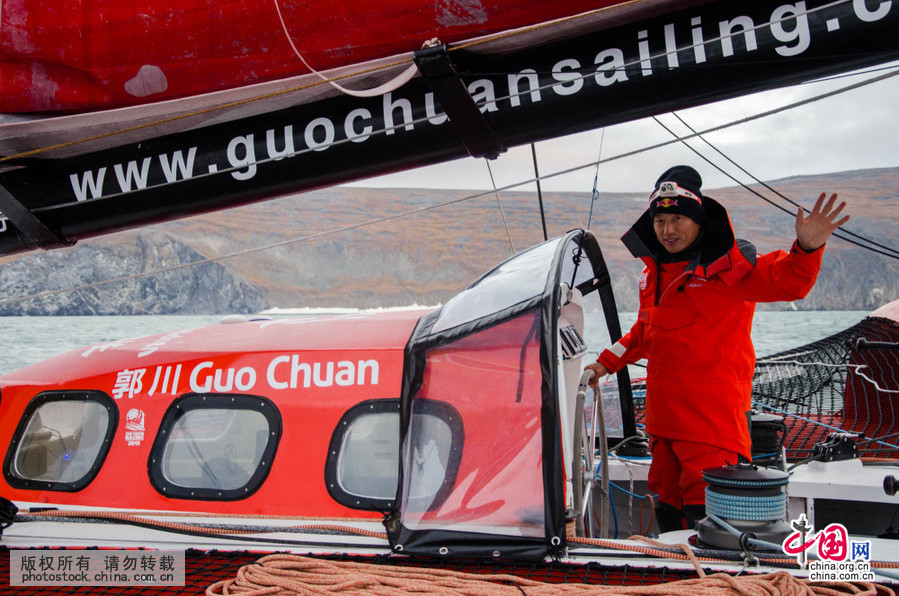 北京时间9月16日凌晨零点48分24秒,郭川船长亲自掌舵,率领五名国际船员驾驶“中国·青岛”号冲过了世界帆船速度记录委员会在白令海峡设置的终点线,一个新世界纪录诞生了。(中国网图片库摄影/陈志伟)