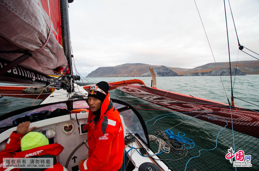 北京时间9月16日凌晨零点48分24秒,郭川船长亲自掌舵,率领五名国际船员驾驶“中国·青岛”号冲过了世界帆船速度记录委员会在白令海峡设置的终点线,一个新世界纪录诞生了。(中国网图片库摄影/陈志伟)