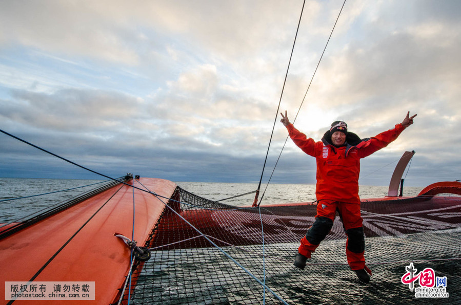 北京时间9月16日凌晨零点48分24秒,郭川船长亲自掌舵,率领五名国际船员驾驶“中国·青岛”号冲过了世界帆船速度记录委员会在白令海峡设置的终点线,一个新世界纪录诞生了。(中国网图片库摄影/陈志伟)