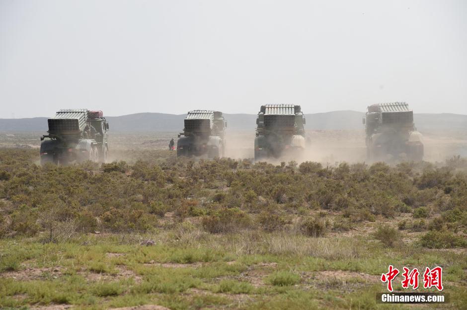 9月17日,“火力—2015青铜峡G”演习进入实弹检验阶段,参加演习的解放军第27集团军某炮兵旅装备的多型火炮、多种弹药接受实战检验。图为火箭炮占领发射阵地。中新社发刘逢安 摄