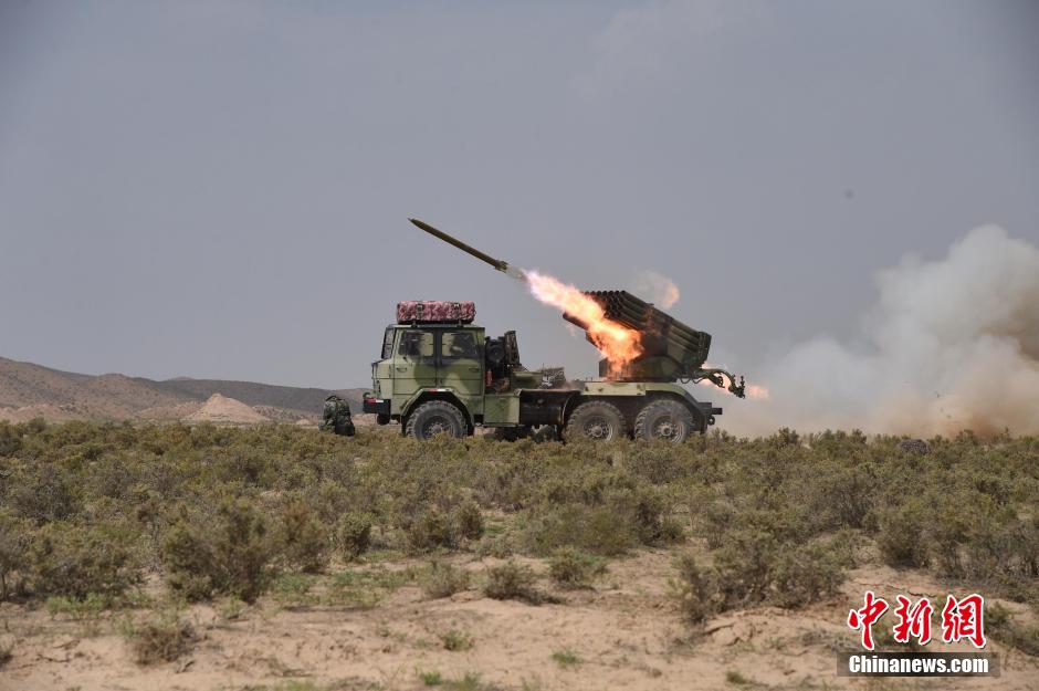 9月17日,“火力—2015青铜峡G”演习进入实弹检验阶段,参加演习的解放军第27集团军某炮兵旅装备的多型火炮、多种弹药接受实战检验。图为火箭炮实弹发射。中新社发刘逢安 摄