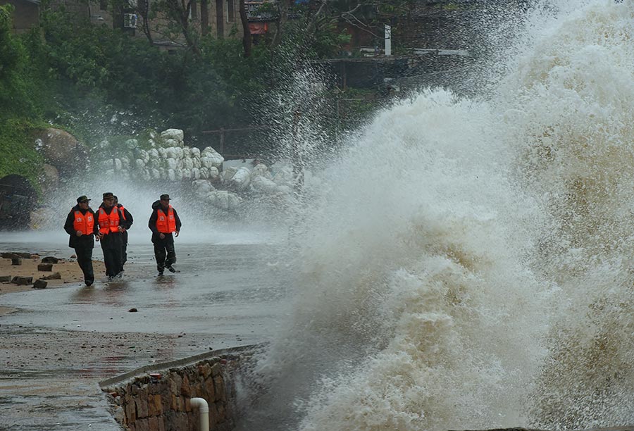 9月29日,边防官兵在连江县苔箓镇茭南村澳口巡逻。当日8时50分,今年第21号台风“杜鹃”在莆田市秀屿沿海登陆,登陆时中心最大风力为12级(33米/秒)。受“杜鹃”影响,28日白天到29日早晨,福建中北部沿海地区出现暴雨,部分乡镇出现大暴雨,阵风达到13至14级。新华社记者张国俊 摄