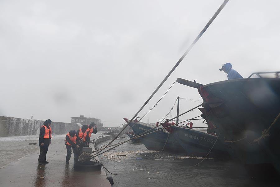 9月29日,在福建省泉州市惠安县崇武镇大岞港,崇武边防派出所民警帮助当地渔民加固渔船。此处据台风登陆点直线距离约30公里。受今年第21号台风“杜鹃”影响,当日上午,福建中北部沿海地区出现暴雨,部分乡镇出现大暴雨,阵风达到13至14级。在福建省泉州市惠安县崇武镇沿海地区,记者看到,狂风卷着两三层楼高的巨浪漫过海防堤坝,不少地段出现积水内涝。新华社记者宋为伟摄