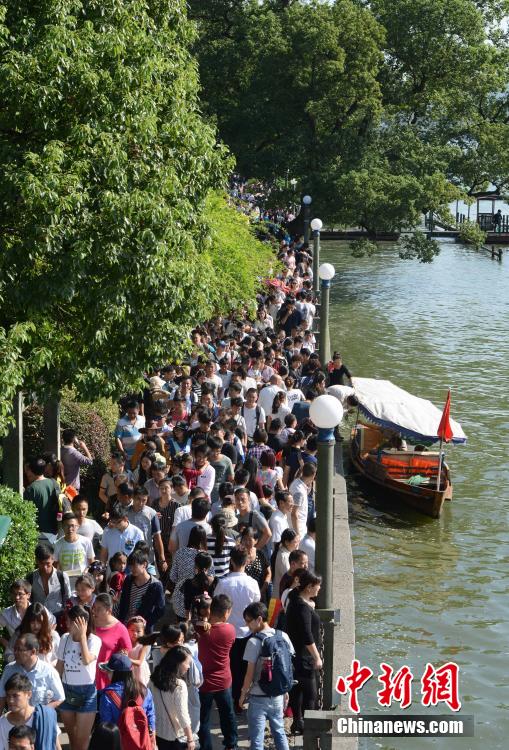 10月2日,杭州断桥景区再现“人桥”景观。国庆假期首日,浙江杭州西湖景区共迎客38.80万人次,西湖景区著名景点断桥亦是人头攒动。中新社记者李晨韵摄