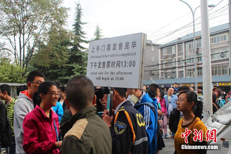 “十一”黄金周大幕再启,来自各地的游客纷至沓来,10月2日西安多处景点人员拥挤,排起了长队。大雁塔、历史博物馆、城墙、回民街等景点人气爆棚。图为由于游客过多,陕西省历史博物馆早晨的门票早早就发放完毕。李思默摄