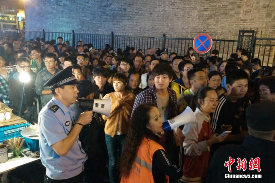 国庆黄金周期间,西安著名的美食一条街回民街日均旅客流量达到30万,西安市公安局莲湖警方每天出动力警200余人,维护秩序,并在回民街拉起人墙进行分流,防止踩踏事故。警方供图