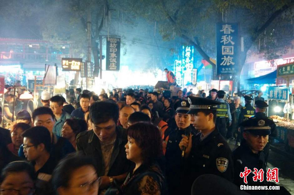 国庆黄金周期间,西安著名的美食一条街回民街日均旅客流量达到30万,西安市公安局莲湖警方每天出动力警200余人,维护秩序,并在回民街拉起人墙进行分流,防止踩踏事故。警方供图