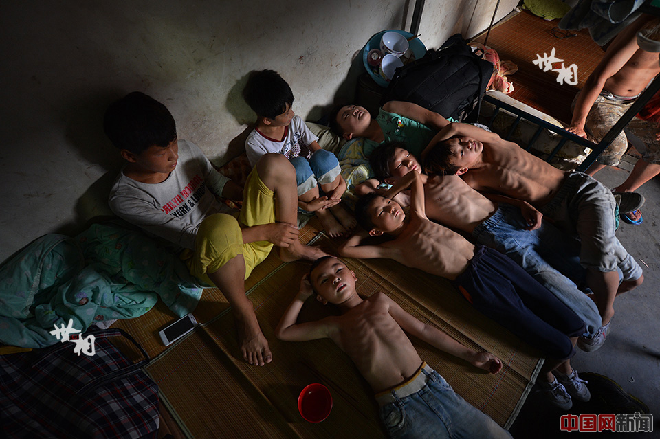暑假期间,前来学杂技的孩子非常多,一张床睡三四个孩子,一个宿舍十几个孩子很正常,好在有空调。