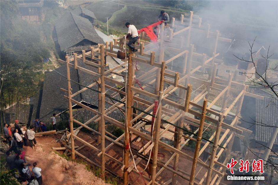 10月26日,广西三江侗族自治县林溪镇高友村村民在协力搭建新吊脚楼。在举行祭梁仪式后,数十名侗族男子齐心协力将一排排木扇竖起,随后便是钉椽角、盖瓦、装板壁。吊脚木楼通风防潮、冬暖夏凉,是一种极富侗族特色的住宅建筑。今年为留住乡愁,保护侗族传统村落,广西官方通过了《三江侗族自治县少数民族特色村寨保护与发展条例》立法保护侗寨。图为上梁仪式。 杨春茂 摄