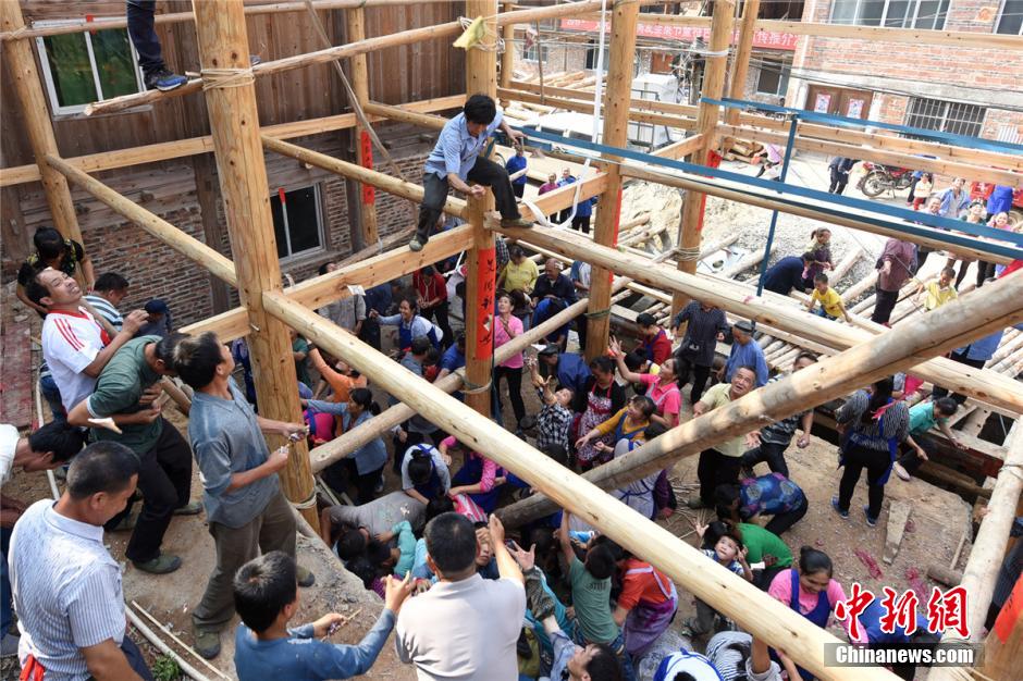 10月26日,广西三江侗族自治县林溪镇高友村村民在协力搭建新吊脚楼。在举行祭梁仪式后,数十名侗族男子齐心协力将一排排木扇竖起,随后便是钉椽角、盖瓦、装板壁。吊脚木楼通风防潮、冬暖夏凉,是一种极富侗族特色的住宅建筑。今年为留住乡愁,保护侗族传统村落,广西官方通过了《三江侗族自治县少数民族特色村寨保护与发展条例》立法保护侗寨。图为抛撒喜糖。龚普康 摄