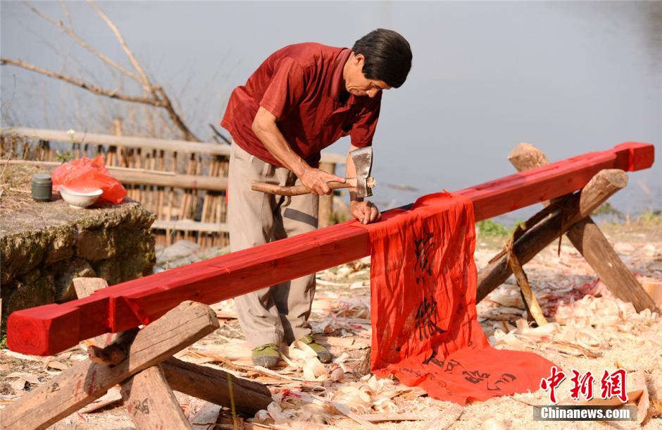 10月26日,广西三江侗族自治县林溪镇高友村村民在协力搭建新吊脚楼。在举行祭梁仪式后,数十名侗族男子齐心协力将一排排木扇竖起,随后便是钉椽角、盖瓦、装板壁。吊脚木楼通风防潮、冬暖夏凉,是一种极富侗族特色的住宅建筑。今年为留住乡愁,保护侗族传统村落,广西官方通过了《三江侗族自治县少数民族特色村寨保护与发展条例》立法保护侗寨。图为装饰屋梁。龚普康 摄