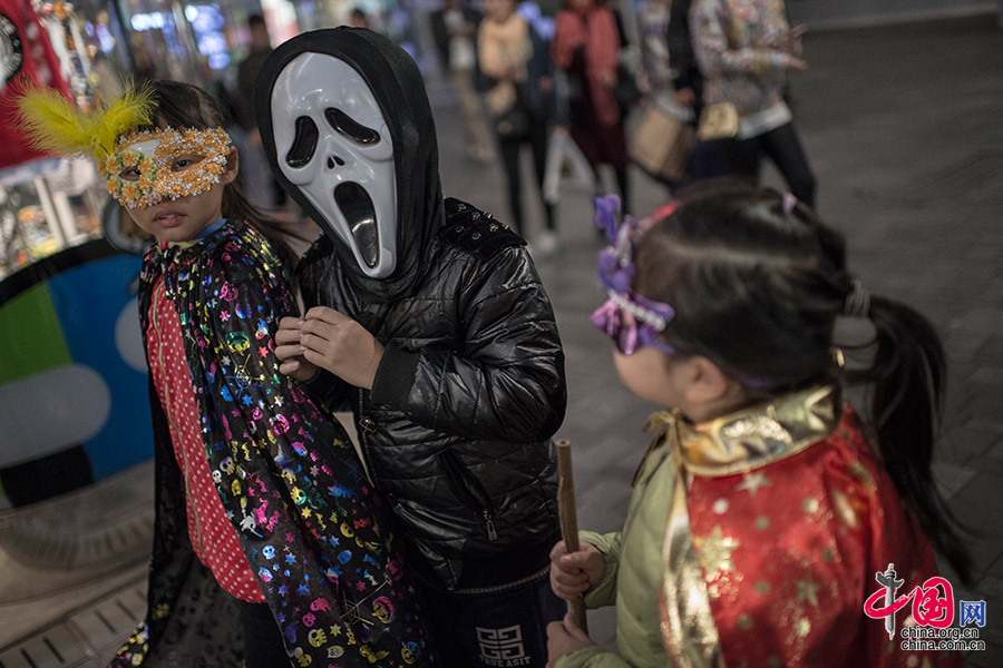 10月31日晚,北京三里屯太古里附近,孩子装扮后走上街头庆祝节日。中国网记者 牛博 摄