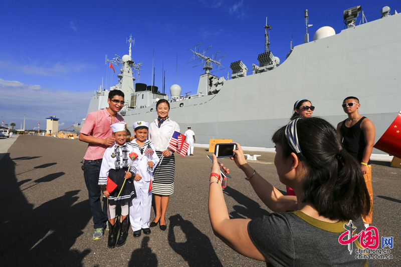 参加码头欢迎仪式的中美人员纷纷以舰艇为背景拍照留念 代宗锋摄