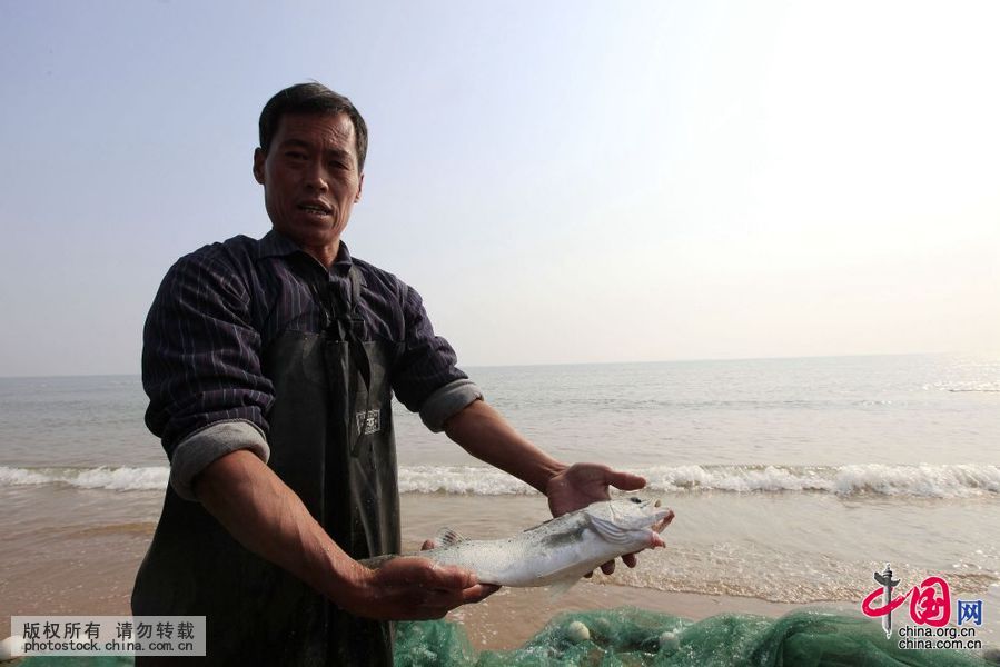 渔民在灵山湾畔拉大网捕鱼(摄影 中国网图片库/韩加君)