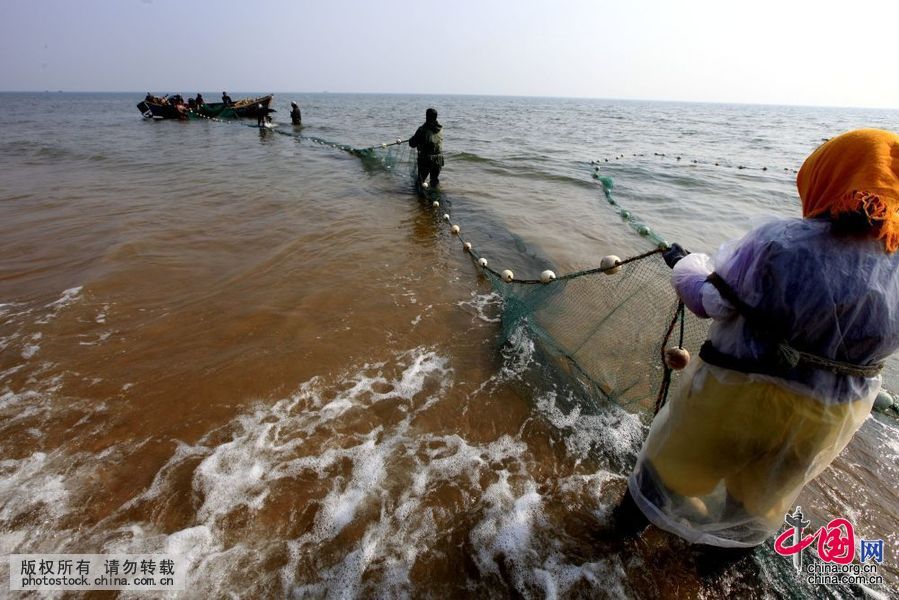 渔民在灵山湾畔拉大网捕鱼(摄影 中国网图片库/韩加君)