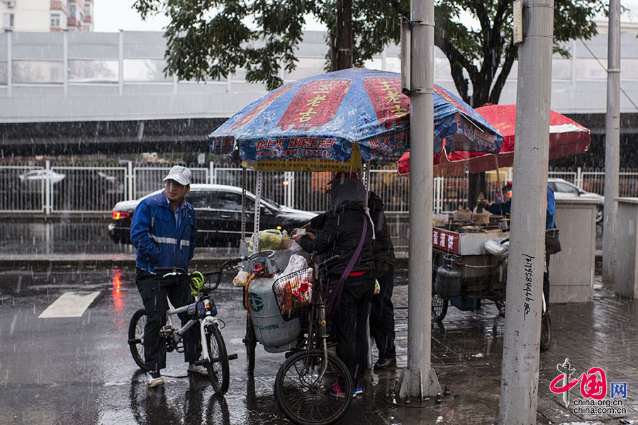 11月6日清晨,北京市民雪中出行。 中国网记者 牛博摄