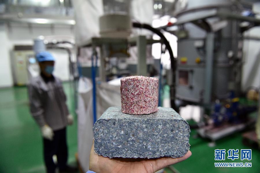 在南京钞票处理中心,旧钞碎片被压成的红色(100元)柱体和蓝灰色(10元)方砖(11月4日摄)。新华社记者 李鑫摄图片来源:新华网