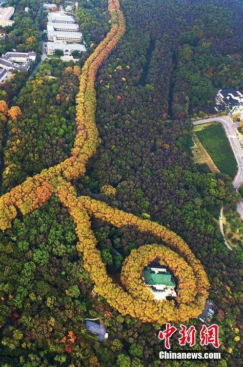 11月11日,南京紫金山美龄宫两侧种满的法国梧桐树叶开始发黄,从空中俯瞰犹如一串项链,煞是好看。眼下正是南京紫金山迎来一年中最美的季节,种植的乌桕、榉树、银杏、三角枫、梧桐等树种,呈现出一幅美丽的画卷。泱波 摄