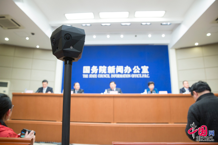 12月9日上午,国新办第二届世界互联网大会新闻发布会会场,测试中的全景视频采集设备。中国网记者 张若梦 摄