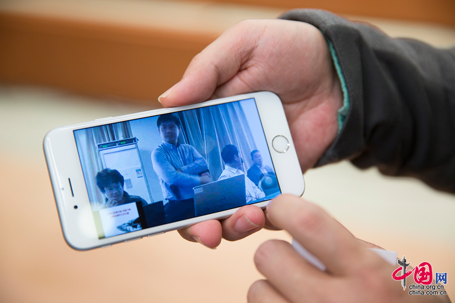 12月9日上午,国新办第二届世界互联网大会新闻发布会会场,项目负责人谢海永向记者展示全景视频采集设备录制的视频。中国网记者 张若梦 摄
