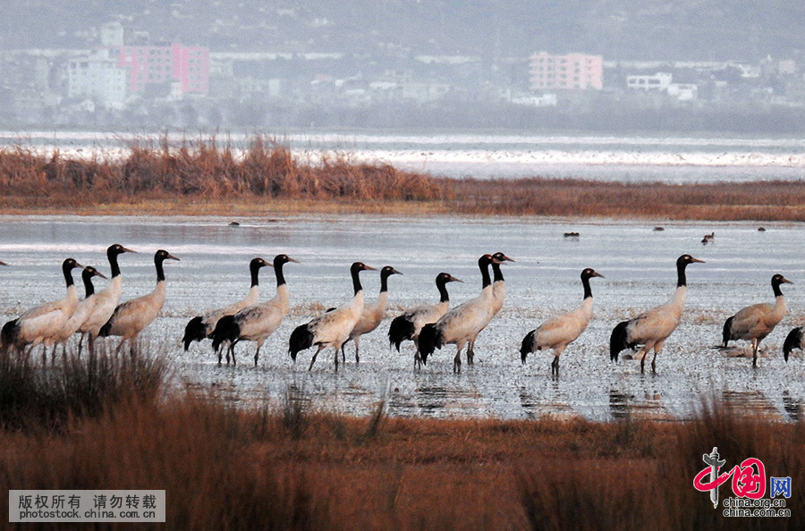 2016年1月3日,在贵州草海保护区内越冬的黑颈鹤。杨文斌摄影 中国网图片库