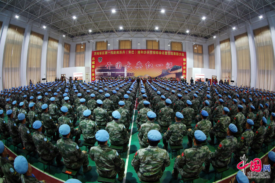 中国网山东讯(记者郑亮)1月4日上午10时,第一批赴南苏丹(朱巴)维和步兵营授称命名暨总结表彰大会在陆军第26集团军某旅礼堂隆重举行。在执行任务的209天里,该步兵营圆满完成各类任务4000余次,处置应对难民营骚乱、武装冲突等各类突发情况20余起,被济南军区授予“国际维和模范营”荣誉称号。