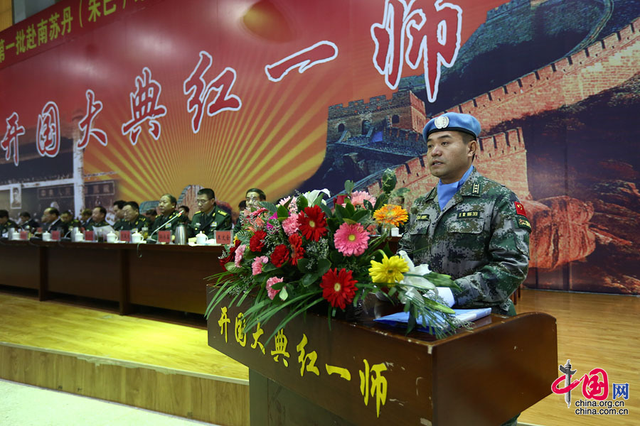 1月4日上午10时,第一批赴南苏丹(朱巴)维和步兵营授称命名暨总结表彰大会在陆军第26集团军某旅礼堂隆重举行。图为维和步兵营营长王震代表维和官兵发言。中国网 郑亮 摄影