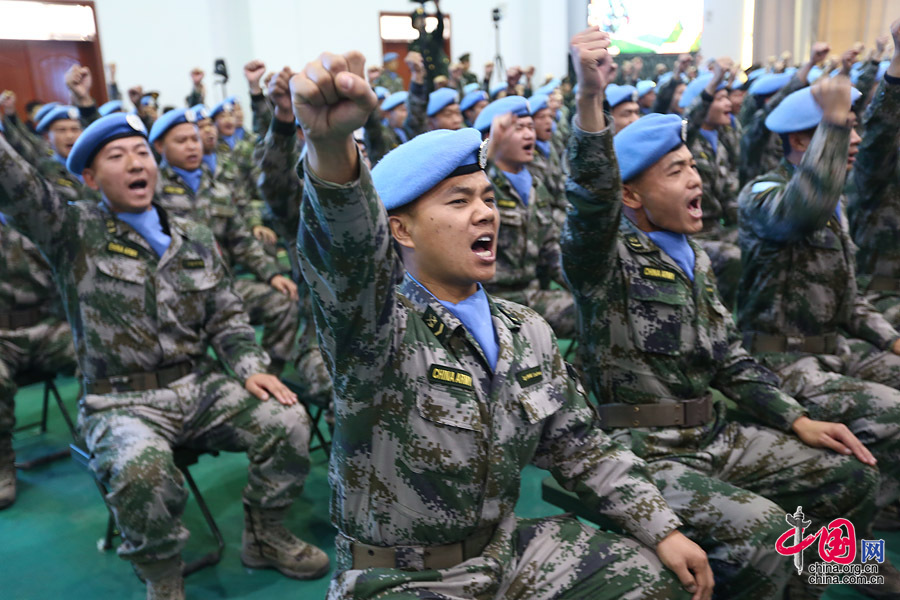 1月4日上午10时,第一批赴南苏丹(朱巴)维和步兵营授称命名暨总结表彰大会在陆军第26集团军某旅礼堂隆重举行。图为维和步兵营官兵现场宣誓。中国网 郑亮 摄影