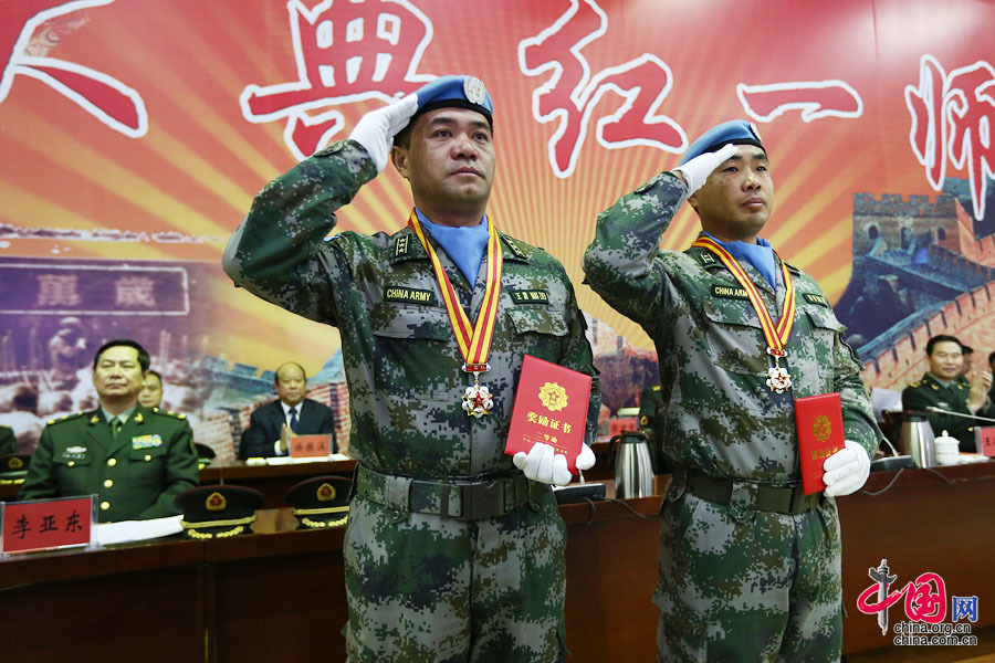1月4日上午10时,第一批赴南苏丹(朱巴)维和步兵营授称命名暨总结表彰大会在陆军第26集团军某旅礼堂隆重举行。图为受表彰官兵代表敬礼。中国网 郑亮 摄影
