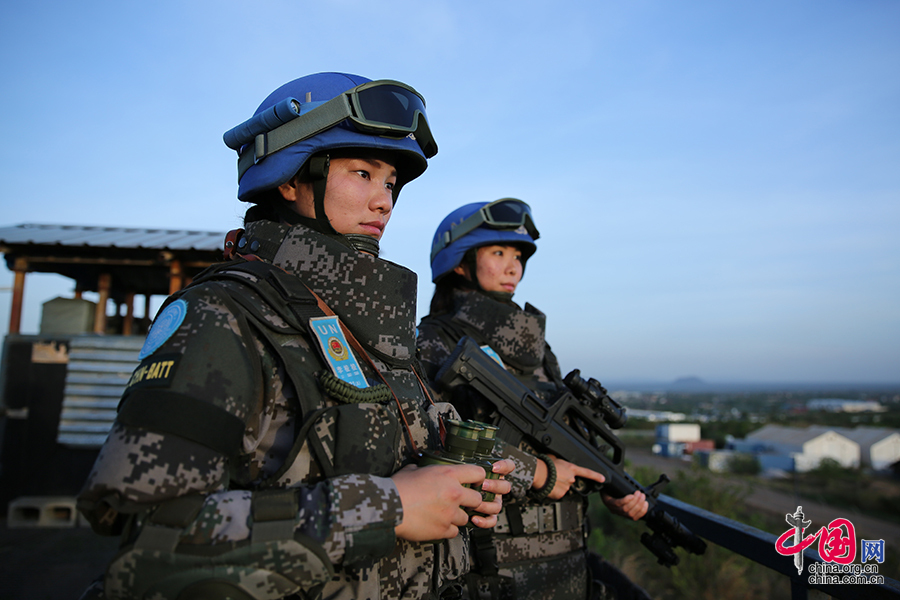 维和步兵营女兵在执行营区防卫任务 潘思危摄