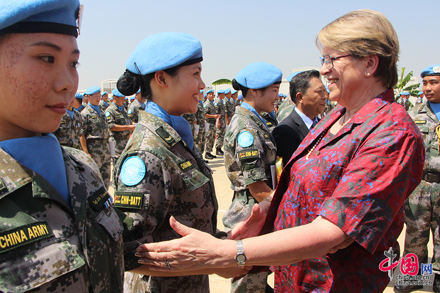 联合国秘书长特别代表罗伊女士为维和步兵营女兵班授勋。孟伟建摄