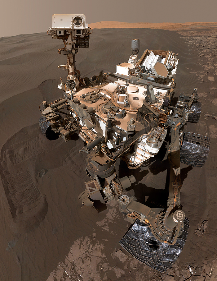 “好奇号”自拍照。它2012年8月成功登陆火星表面,是世界上第一辆采用核动力驱动的火星车,其使命是探寻火星上的生命元素。图片来源:NASA官网