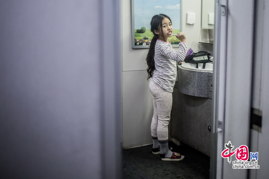 小乘客在进行洗漱,准备休息。中国网记者 郑亮摄影