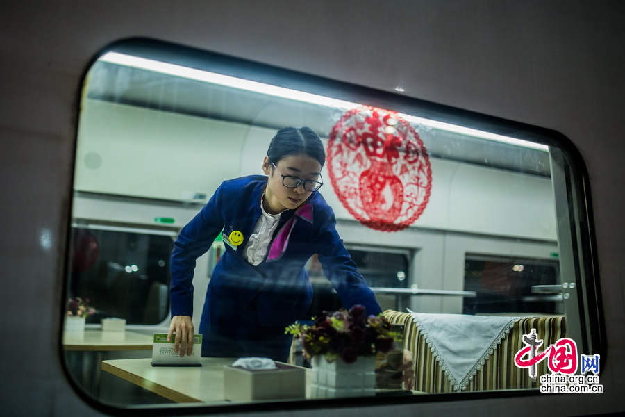 动卧列车都是夕发朝至的行车时间,发车前乘务员在进行餐车最后的整理工作,车窗上的窗花提醒着我们:“春节就快到了,咱们要准备回家了。” 中国网记者 郑亮摄影