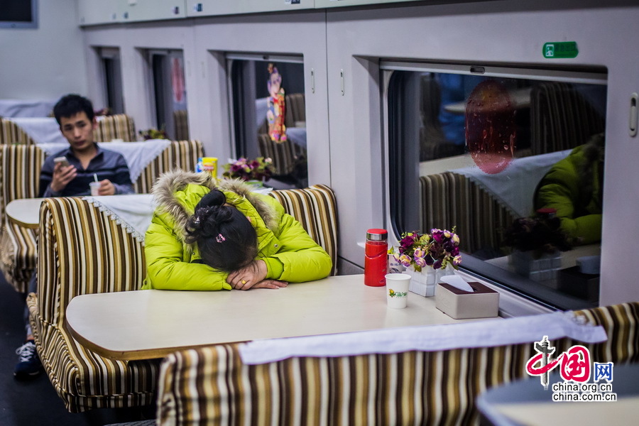 有很多补票上车的乘客暂时没有铺位,舒适的餐车成了他们暂时休息的地点。中国网记者 郑亮摄影