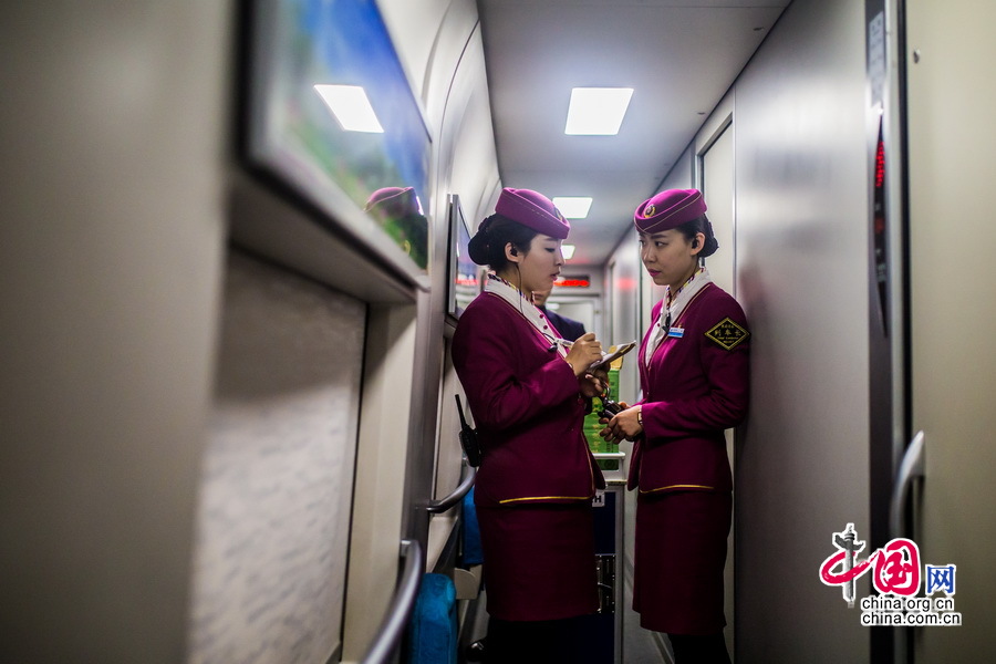 列车长在和巡视中的乘务员沟通,一旦发现问题可以及时处理。中国网记者 郑亮摄影
