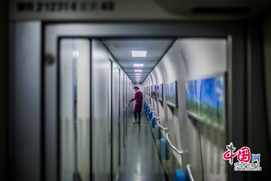 列车长对自己班组的乘务员要求每15分钟对自己负责的车厢做一次巡视,而她自己则要走过全部16节车厢进行巡视。中国网记者 郑亮摄影