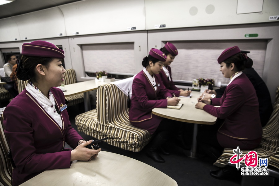 列车长利用巡视的间隙召集乘务组全体人员开会,此时已经是凌晨1点多了,开完会后她们将开始新一轮的巡视检查。中国网记者 郑亮摄影