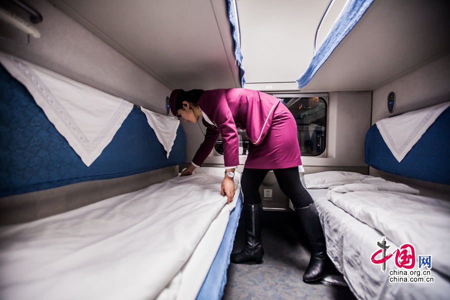 乘务员在整理卧铺包房,再过一会乘客就要躺在这里开始自己的旅程了。中国网记者 郑亮摄影