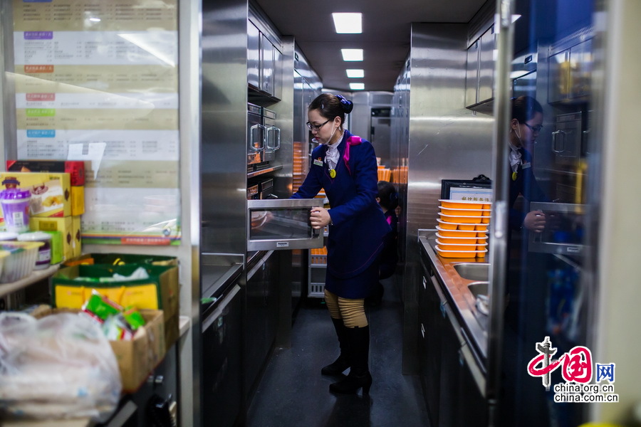 餐车的乘务员为乘客加热饭菜。中国网记者 郑亮摄影