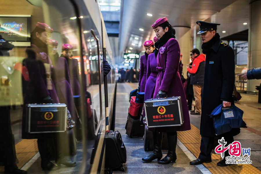 列车进站后乘务组提前上车进行准备,车上常备的医药箱可以为乘客提供紧急治疗,保证乘客安全。中国网记者 郑亮摄影