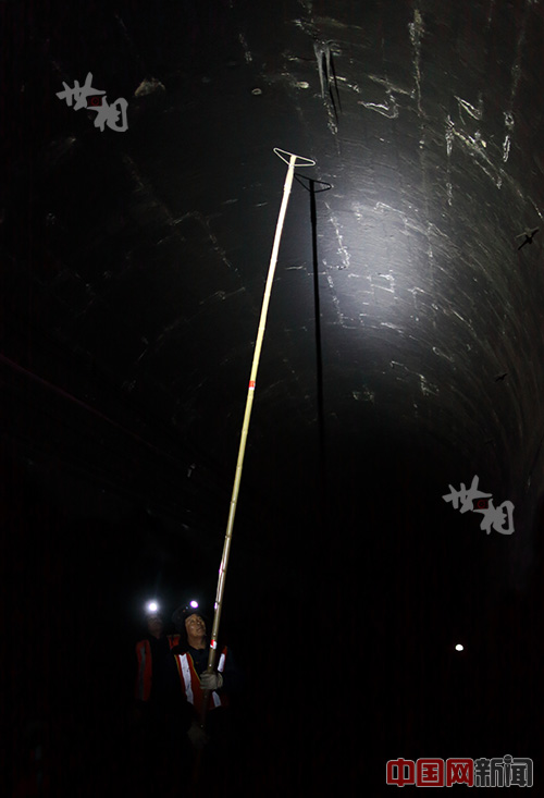 每次进隧道,陆辉他们都要借助头顶的探照灯,认真观察隧道顶部的冰柱,并用长竿卖力清理。“顶部的冰柱尤其得仔细看。如果没打掉,掉下来砸到列车就坏了。”