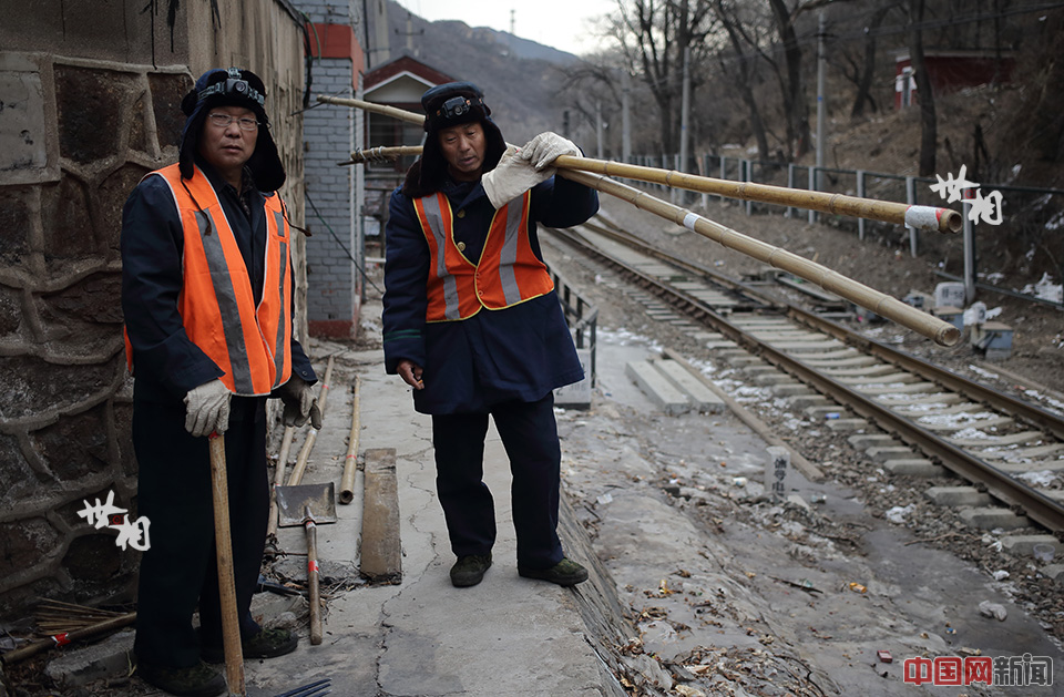 北京铁路局北京工务段南口桥梁工区桥隧工、57岁的陆辉(画面左)和55岁的张庆华扛上打冰工具,准备进入八达岭隧道打冰。