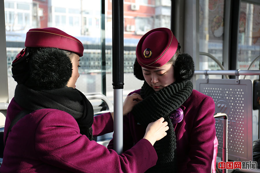 在公交车上,列车长帮助同事整理着装。中国网 王梦泽 摄
