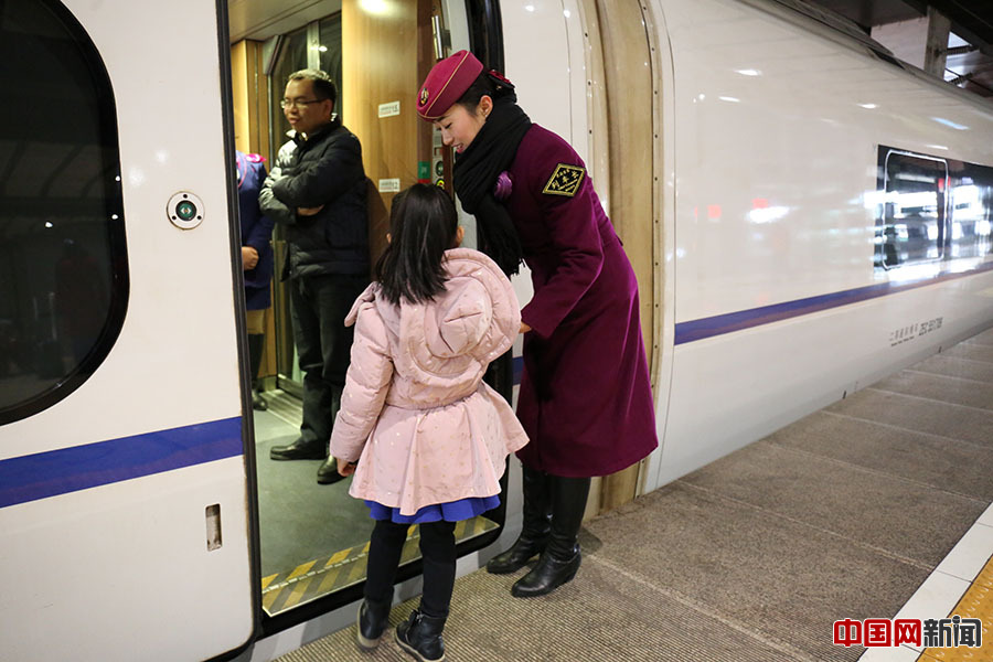 2016年2月4日,G13次列车长帮助小朋友安全乘坐列车。中国网 王梦泽 摄