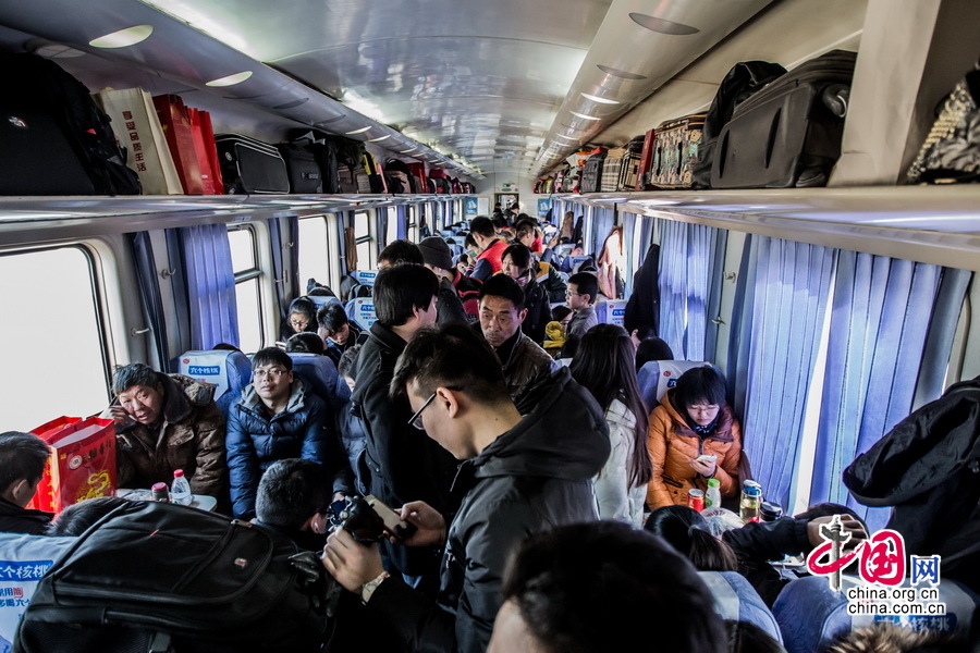 春运期间,很多乘客只能这样站在车厢的过道里。中国网记者郑亮摄影