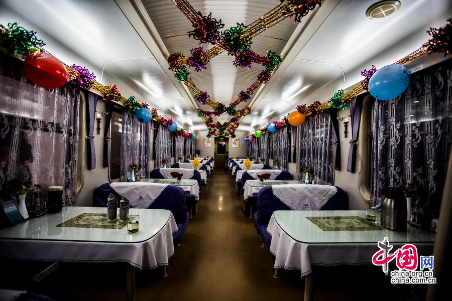 被乘务组工作人员装饰的很有节日气氛的餐车。中国网记者郑亮摄影