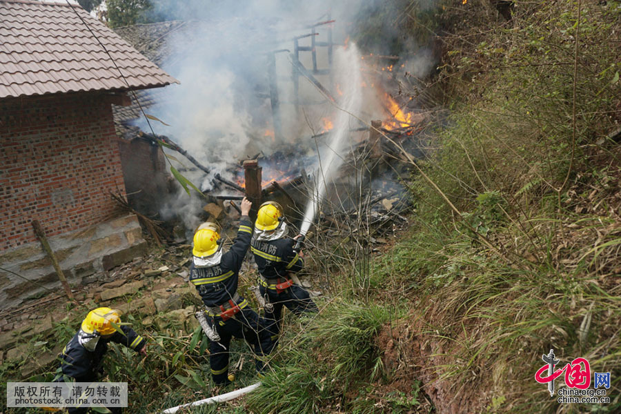 2月21日上午,四川省内江市消防支队官兵正在铺设水枪灭火。中国网图片库 雷肖摄