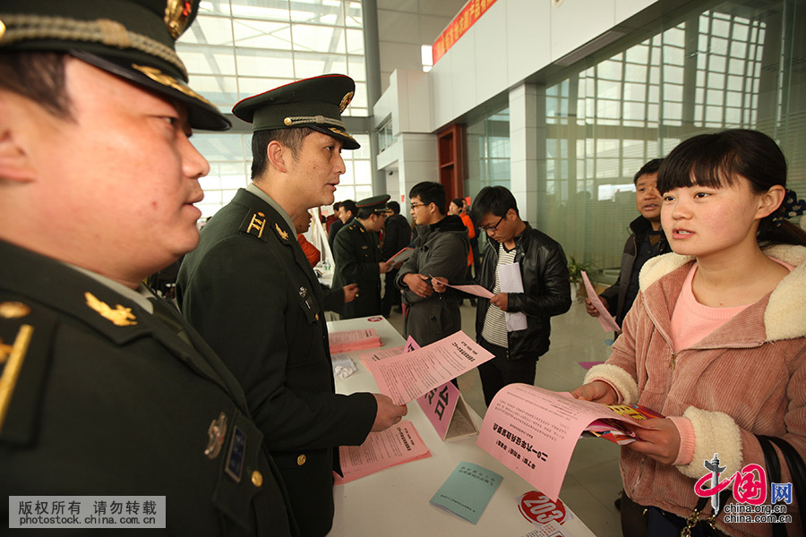 2月23日,安徽省蒙城县,参加招聘会的适龄青年和家长现场向县征兵办工作人员咨询征兵政策和征兵信息。 中国网图片库 胡卫国摄影