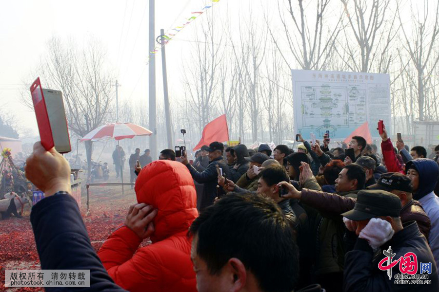 2月25日是农历正月十八,东海神庙祭海祈福现场近千米长的鞭炮,燃放后现场浓烟滚滚,如山洪海啸,现场村民躲闪中不忘拿手机拍照。中国网图片库莱州 摄